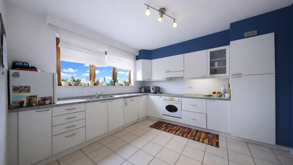 De lichtrijke leefruimte sluit aan op een uitgeruste keuken (er komen nieuwe aparaten), perfect voor wie graag kookt en gasten ontvangt.